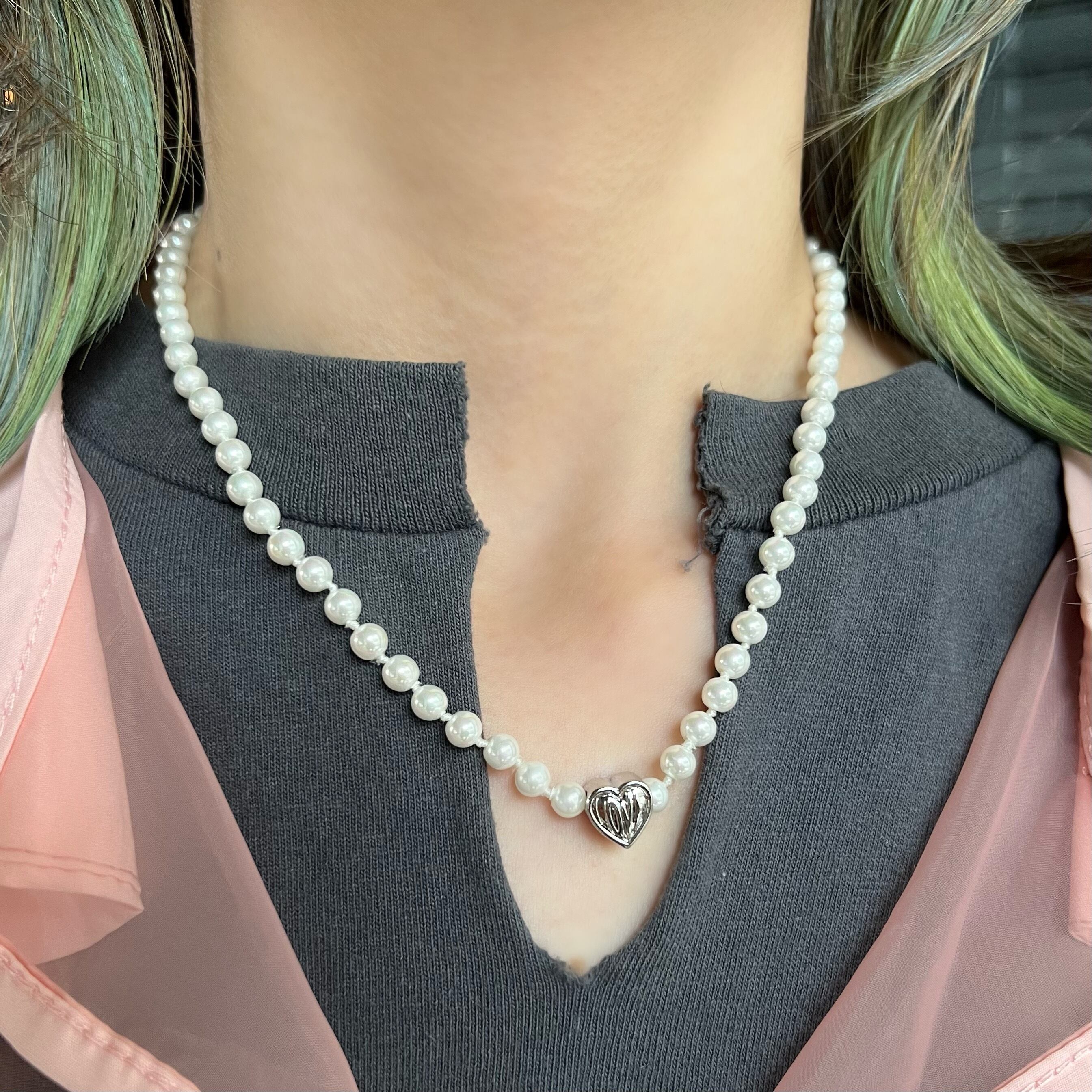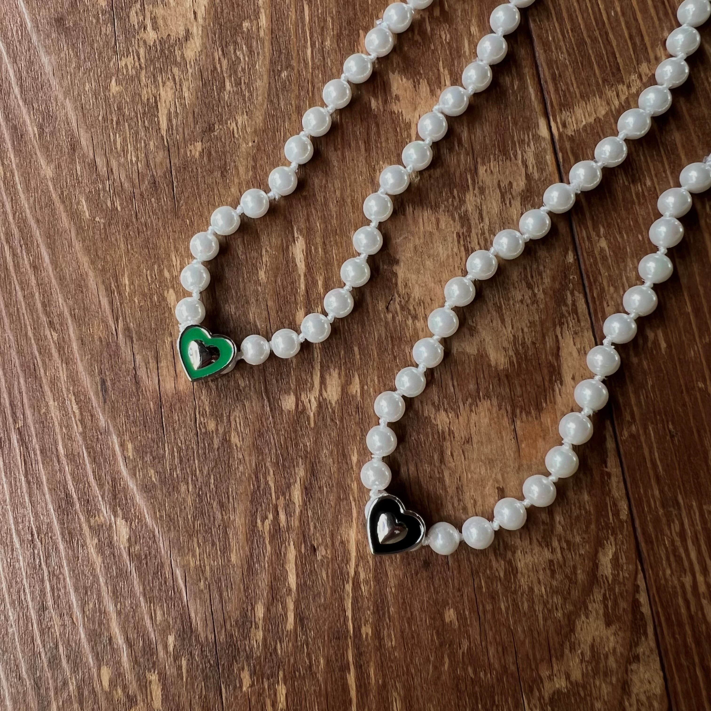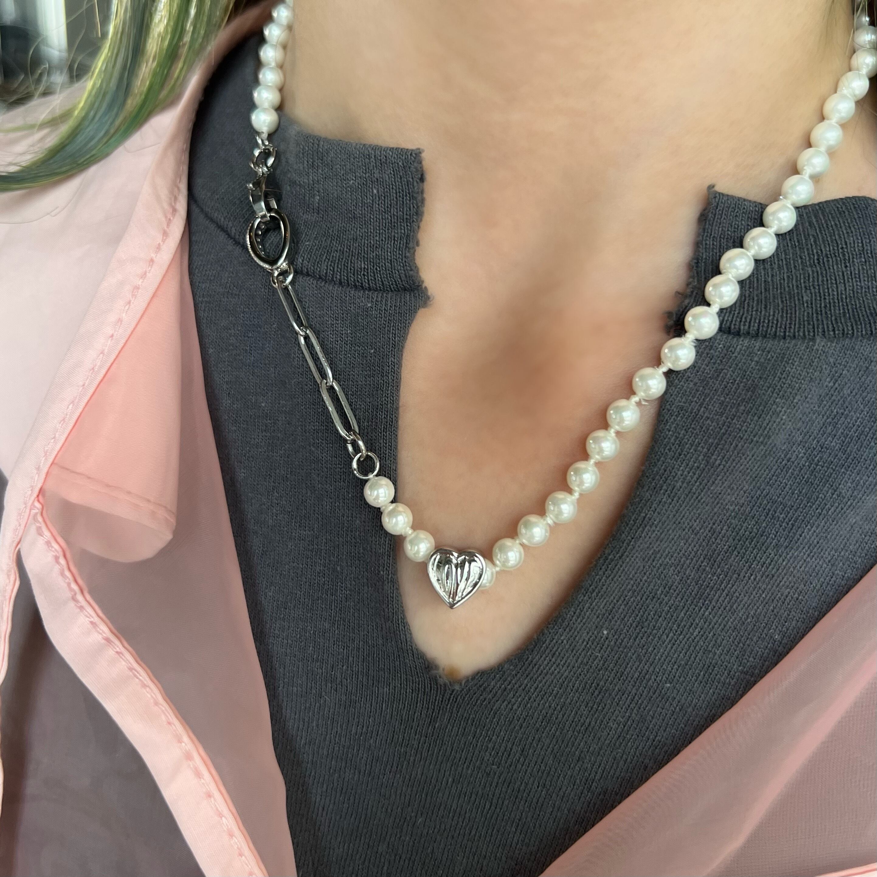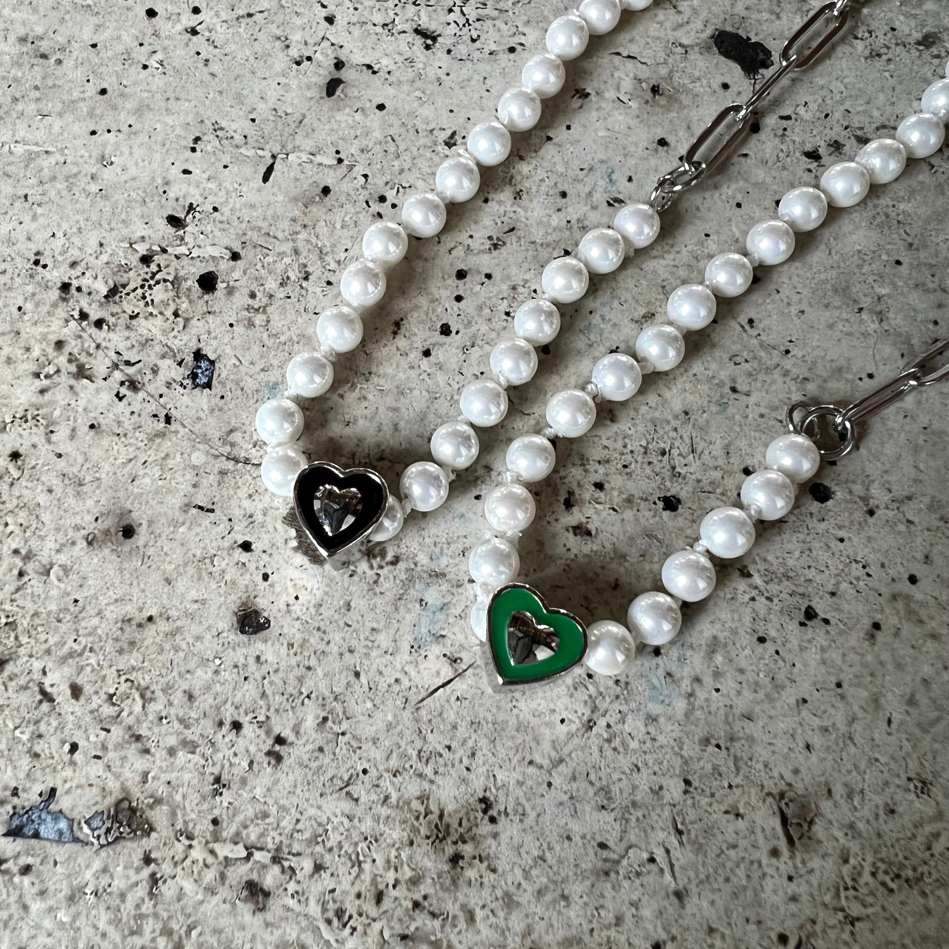チェーンとパールビーズにハートモチーフを組み合わせたデザインが、他にはあまりないです。こちらは一つ一つ手作りで制作されており、オリジナル性のあるアクセサリーです。