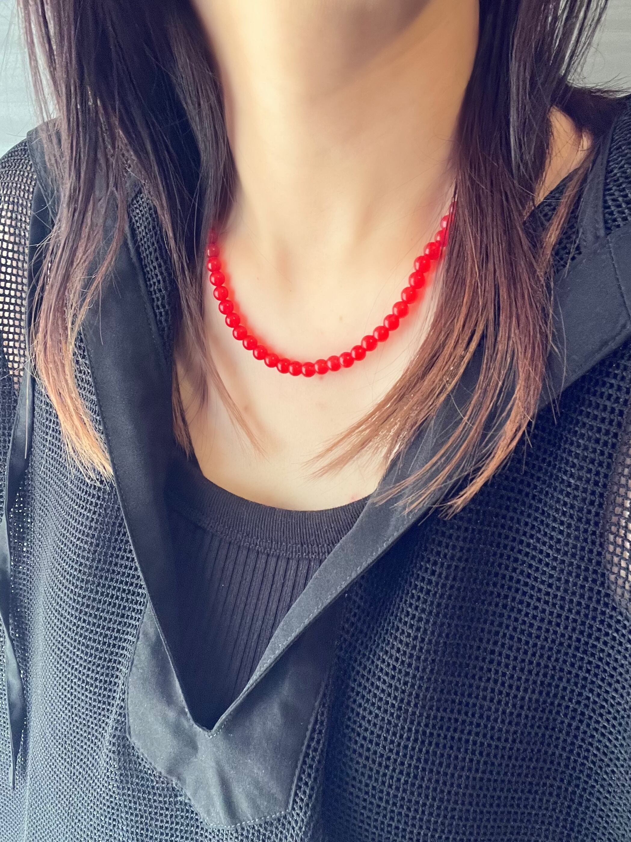 鮮やかな赤色のストーンビーズは、シンプルなスタイルにアクセントを加え、様々なシーンで活躍するアイテムです。